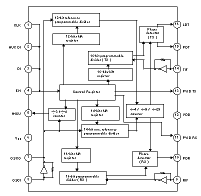 | 9 | RIF | á Input terminal of RX channel counter. á Usually, AC coupled output signal of VCO loop is introduced and the Minimum input signal level is 300mVp-p at 60 MHz |