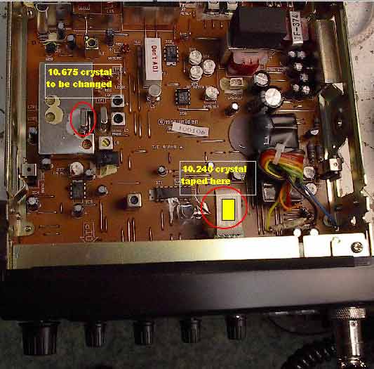 Locate the 10.695MHz ? (picture shows it as 10.675MHz) crystal sticking out of the PLL block. Unplug this crystal and replace with the 10.240mhz crystal.